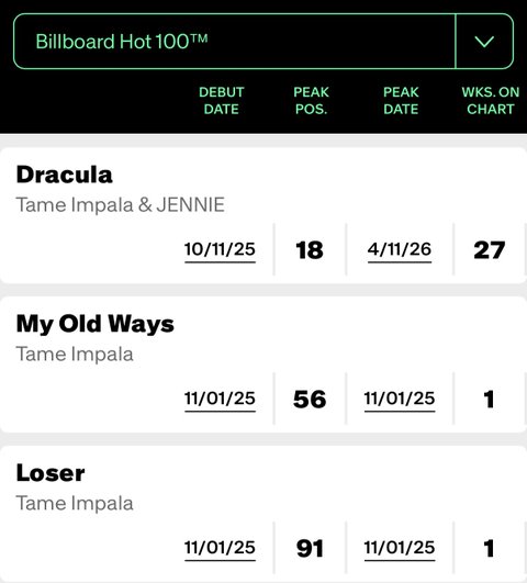 테임임팔라 역대 빌보드 핫백 커하이자 제니 커하