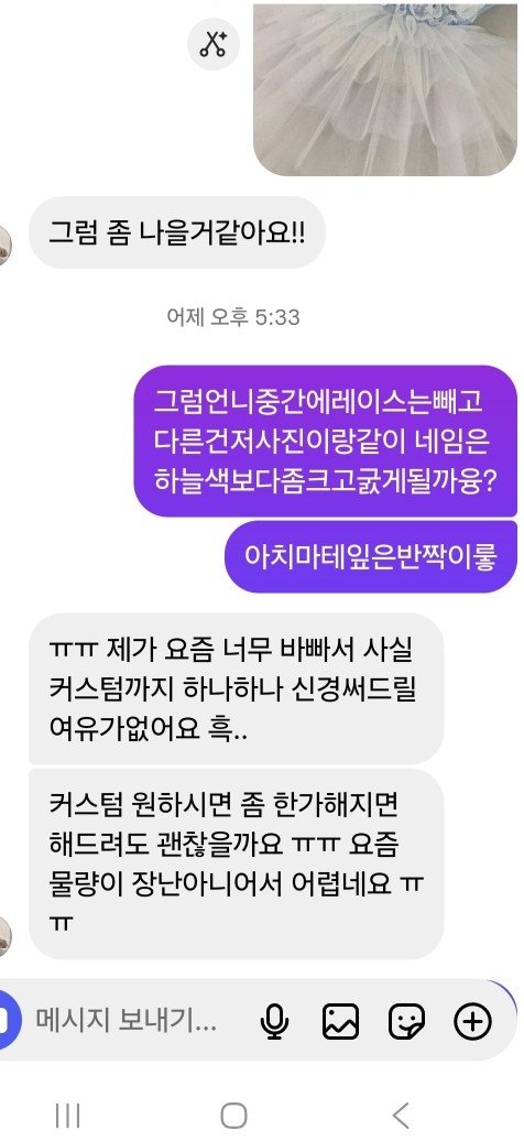 이번에 또 구매를 하려고 이것저것 좀 물어보고 아기옷에 이름을 넣는 옷이라 글씨 좀 크게 해달라고 했어요. 근데 첨엔 판다고 하더니 갑자기 바쁘다며 담에 주문달란식으로 얘기하는데 너무 얼척이 없어서요