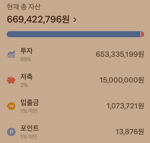 ------추가-------나 자가집도 있어서 월세 따위 안 나가고나도 국민연금 20년 채워서 부웠고 나중에 55세부터 월 몇백씩 받을 예정이고현재도 1년에 주식배당금+채권분배금으로만 2천만원 남짓 들어오는데 굳이 일해야하냐?그래 뭐  큰소리 친거에 비해 얼마 없긴하다 ㅋ 그래도 난 검소해서 커버 된다그리고 투자98%로 찍히지만 나도 대가리가 있지 저게 다 주식이겠냐?98%중에 절반이상은 초안전자산 채권이고 주식은 절반도 안된다진짜 핵심은 큰 돈들여 애새기 낳고 키우는게 멍청하다는거다