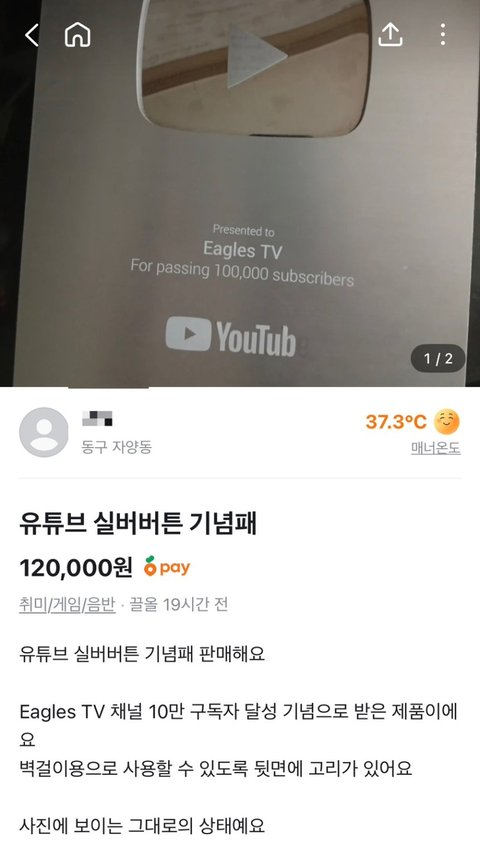 9일 한 야구 커뮤니티에는 '이글스TV 유튜브 근황'이라는 제목의 게시물이 올라왔다. 게시물에는 실버버튼이 중고거래 플랫폼에 올라왔다는 내용과 함께 관련 이미지가 첨부되며 논란이 확산됐다.