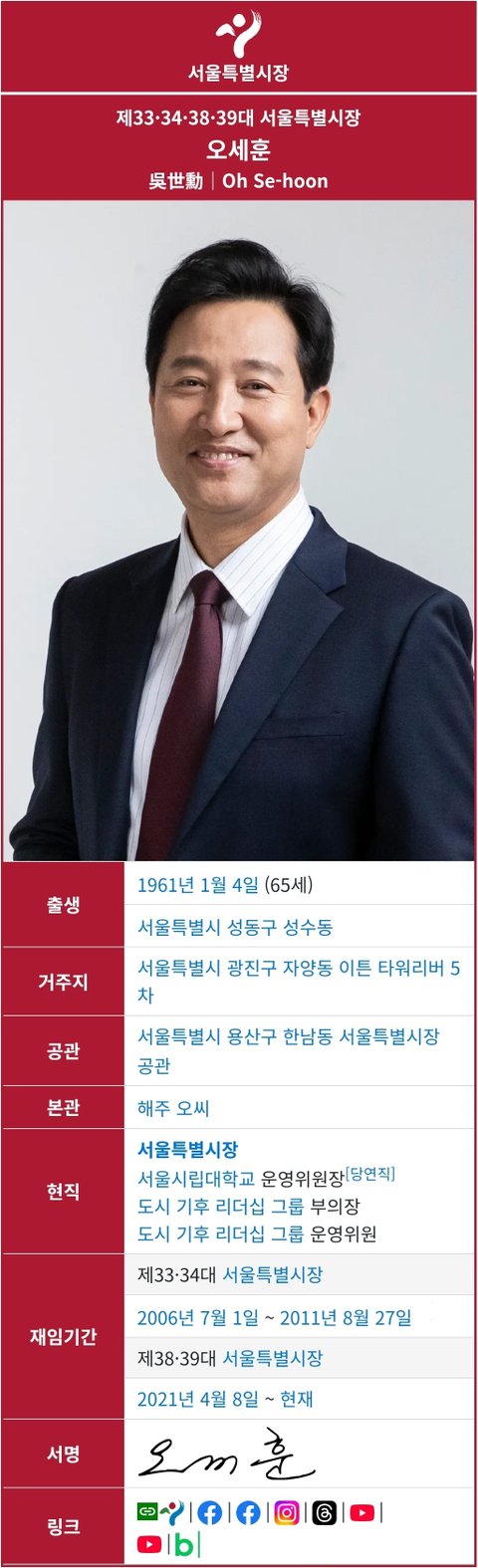 (사진1 설명) 오세훈(吳世勳, Oh Se-hoon) 제33·34·38·39대 서울특별시장 <출처: NAVER 나무위키>