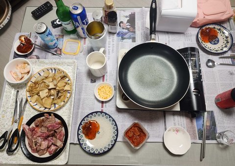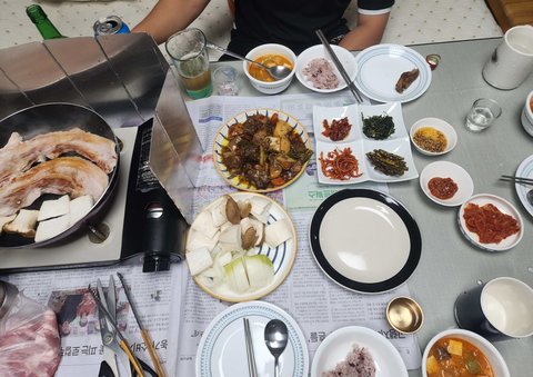 친척 놀러와서 식탁에 신문지깔고 사온 반찬 4종 + 된장찌개에 삼겹살 거무잡잡한건 갈비찜