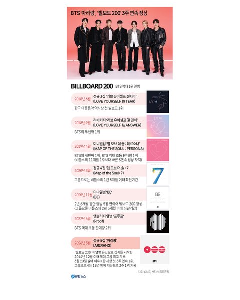 BTS '아리랑', 美 '빌보드 200' 3주 연속 1위…K팝 최초 기록