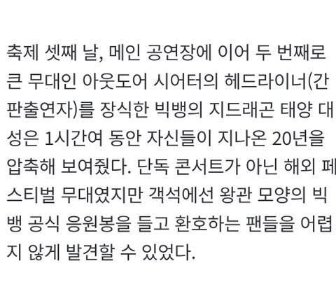 정병아ㅋㅋ 아웃도어사이드 헤드라이너라고 적혀있자나ㅋㅋㅋㅋ문맹샠꺄ㅋㅋㅋㅋ그리고 메인 헤더랑 빅뱅 공연 시간 완전 겹쳤는데도 저정도 8만수용 공연장 꽉 찬건데 너가 생각해도 대단하긴 하지?ㅋㅋㅋㅋㅋ