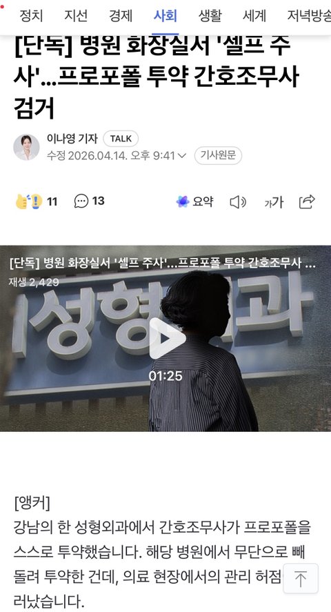 기사 속 강남성형외과 간호조무사가 프로포폴 마약을 빼돌려서 오빠한테 준듯