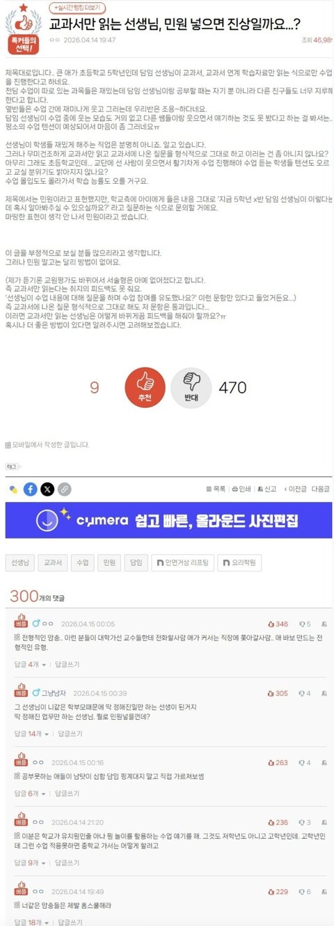 와 대박이다 ㅎㅎㅎㅎ 이걸 욕하려고 올린거야? 교사 욕 먹을만한데 뭐냐. 교사는 평가 받아선 안되는 신적인 존재야? 개구린 교사 걸리면 그냥 어쩔수 없지…ㅜㅜ 이러면서? 이런 마인드 때문에 그냥 월급 루팡하는 교수님 퀄리티 학과장이랑 총장에게 따졌다고 날 이상하게 생각하는 사람 많았구나….이 세상에 월급 루팡하는 사람들은 모두 비난 받고 피드백 받고 수정 개선 해야하는게 맞아. 나도 그냥 쫄래쫄래 출근해서 교과서 읽다가 두시에 퇴근하고 월급 받고 싶다 ㅎ