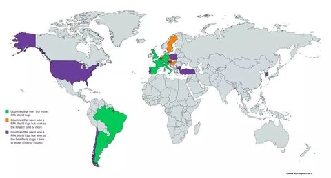 초록색: 월드컵을 1회이상 우승해본 나라 주황색: 우승은 없지만 결승까지 진출했던 나라 보라색: 우승은 없지만 4강까지 진출했던 나라 드넓은 대륙에 한국만 보라색임