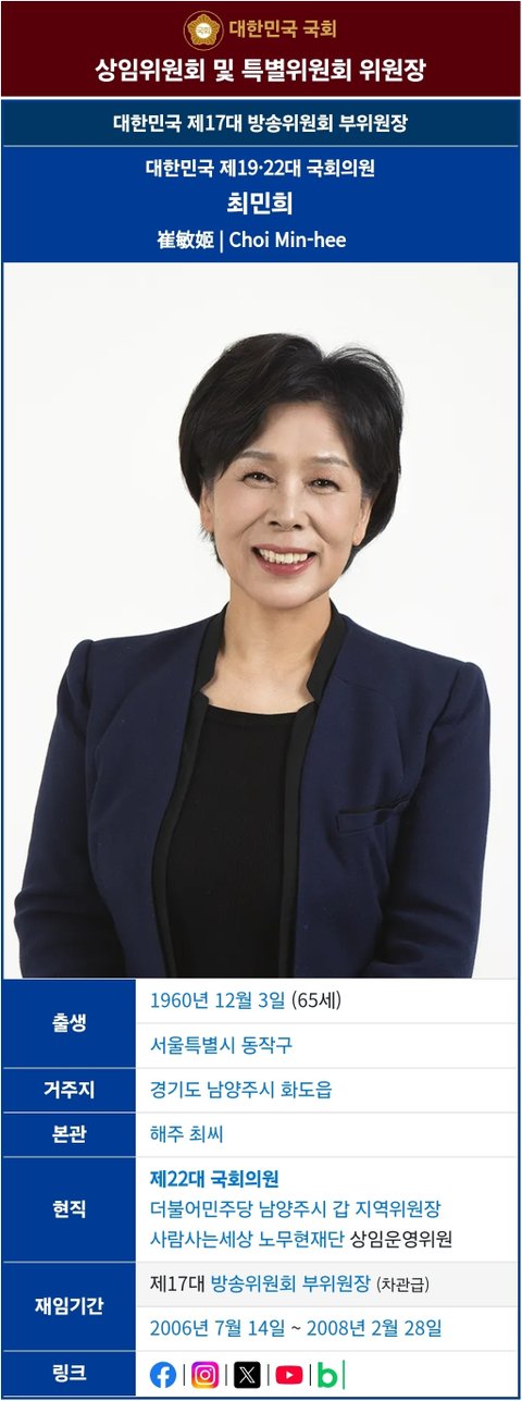 (사진1 설명) 최민희(崔敏姬, Choi Min-hee) 대한민국 제19·22대 국회의원 <출처: NAVER 나무위키>