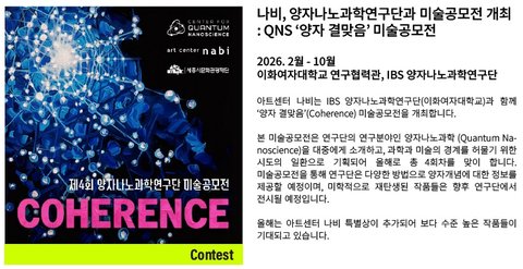 양 기관은 협력의 일환으로 '2026 제4회 결맞음 미술공모전'을 지난 3월부터 공동 추진 중이다. 2019년 시작된 이 공모전은 '양자의 세계', '스핀', '큐비트' 등 양자물리의 주요 개념을 주제로 이어져 왔으며, 올해는 '결맞음(Coherence)'을 주제로 진행된다.