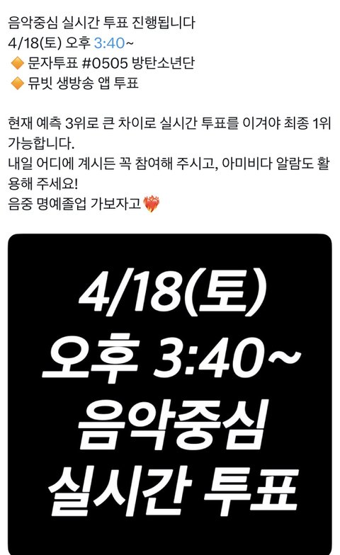 지금 3위라 실투이겨야데 3시 40분부터 #0505 방탄소년단 보내는거 어렵지 않잖아 뮤빗도 앱투표 가능