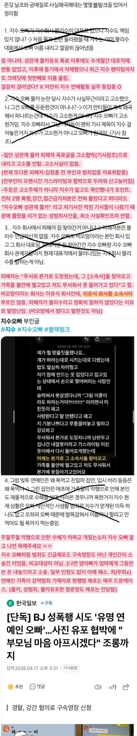 반박이랍시고 쓴 글이 ㅈㄴ 저능하노 몰카 논란은 애초에 지금처럼 증거 가지고 자기 신분까지 밝혀서 제대로 폭로한 글도 아니었고 그냥 커뮤니티에 증거없이 글만 올라왔던거라 중립 지킬수밖에 없던 당시 상황인데 뭐 논란만 떴다고 바로 지수가 나와서 조치해야됨? 적어도 판결이라도 뜨든가 해야 움직이지 그냥 커뮤 글 하나가지고 가족관계 끊고 호적이라도 팜? ㅋㅋ 그리고 블리수 대표직으로 몇개월 계속 있었다는건 증거 어딨음? 당시 등기부등본에 블리수 대표직에 지수 오빠 이름 없었다는데? ㅋㅋ
