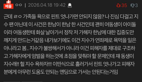 오빠가 한짓이어도 가족이라는 이유로 정이 떨어진다면 뭐 어쩔수 없겠지만 한남이 저지른 여혐 범죄를 가지고 여자형제한테 졸졸 쫓아다니면서 욕박는건 똘추짓 맞긴 하지 ㅋㅋ 오죽하면 피해자 본인도 다른 죄없는 가족은 욕하지말아달라고 두차례나 입장 올리셨겠음
