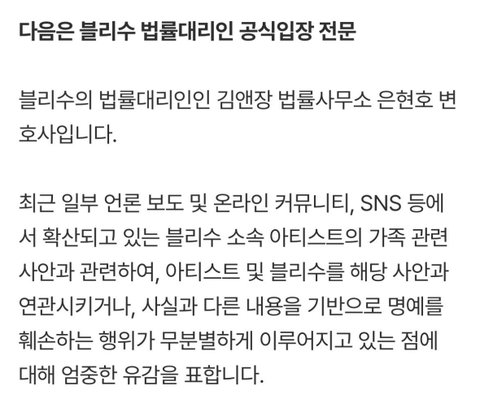 블랙핑크 지수 측, 가족 논란에 입 열었다…"아티스트와 무관한 사안, 지원 없을 것" (전문)