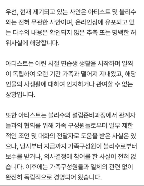 블랙핑크 지수 측, 가족 논란 입장 "일찍 독립해 사생활 인지 NO…금전·경영 관계 無"[전문]