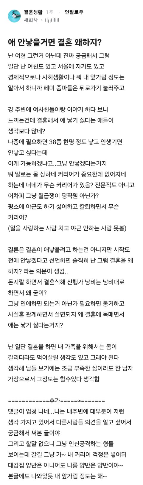 애초에 결혼이 애 낳으려고, 애 키우려고 가족 만들려고 결혼 하는거임 애 낳기 싫으면 결혼을 하지말고 혼인신고도 하지말고.. 동거만 하는게 맞음 가치관 맞는 사람끼리 동거하면 문제 없는데.. 결혼전에 상의 된 것도 아니고 결혼하고서 말바꾸는 사람들 있더라.. 솔직히 나도 여자지만 저런 여자들 이해안감.. 일 하기 싫어서 결혼했는데 애까지 안낳겠다는 여자봄 너무 이기적이라는 생각이 들었음