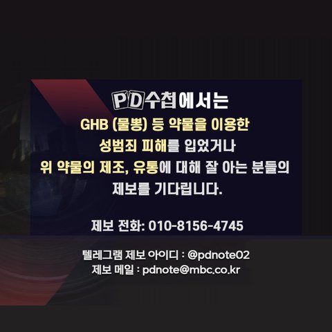 PD수첩에서는 GHB (물뽕) 등약물을 이용한 성범죄 피해를 입었거나위 약물의 제조, 유통에 대해 잘 아는 분들의 제보를 기다립니다
