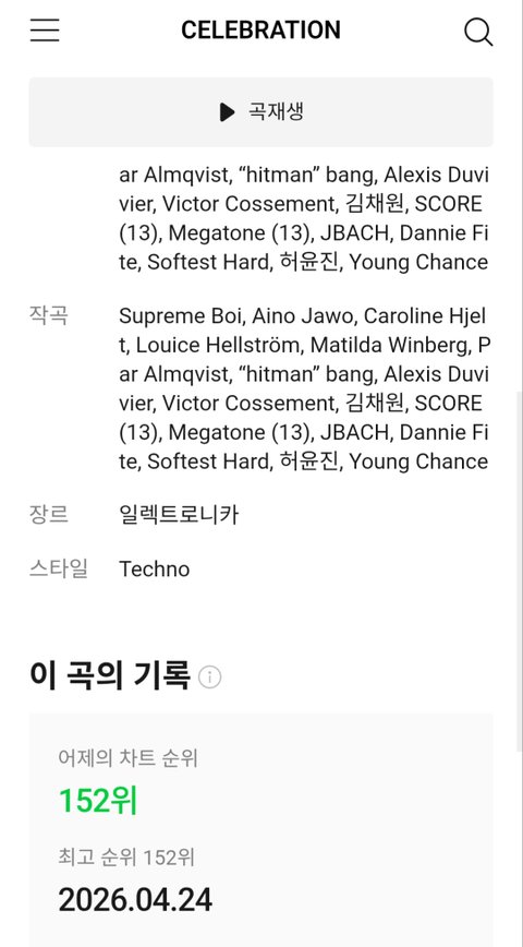 심지어 어제 순위뿐만 아니라 260425 오후 7시 기준 탑백 차트에도 셀레브레이션 없음. 눈을 씼고 찾아봐도.