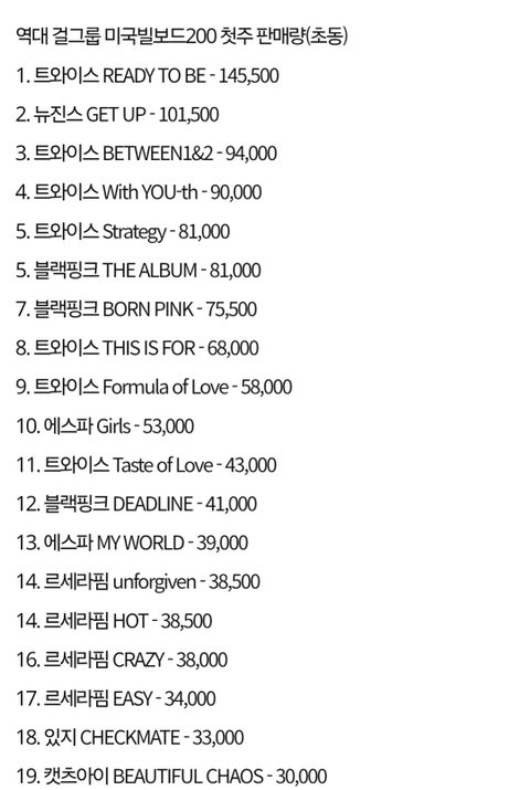 자타공인? 자카르타? 암튼 미국 1황 여신 르세라핌께서 주인공은 마지막에 등장하는 퀸재질 마인드를 실천하시느라 현재 글로벌 차트에 미진입 하심 뉴아에같은 무수리들이 감히 넘볼 수 없는 독보적 아우라의 퀸세라핌의 행보로 인해 그를 추종하는 피어나들은 현재 축제같은 분위기라는 웁쓰 !