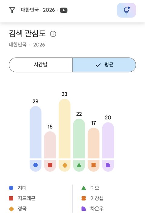 이건 모든 아이돌을 검색어가 아닌 토픽으로 설정해서 나온 수치임 구글이 알아서 설정하고 검색어를 필터링해서 합산해주는거라고함