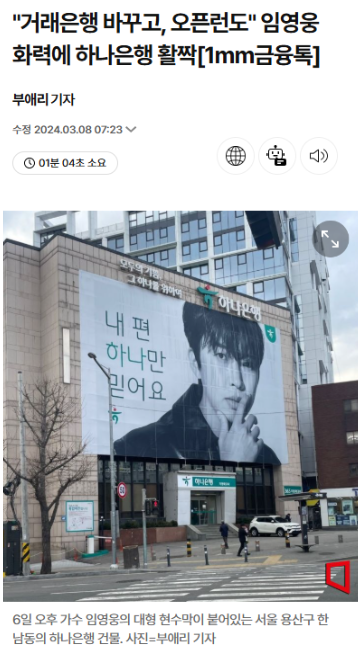ㅇㅇ. 국민은행 쓴지 30년. 통장도 적금도 체크카드도 전부 국민은행이었던 사람이. 임영웅 광고 봤다는 이유로. 그 주 안에. 계좌를 새로 팠음. 이미 갈아탈거 다 갈아탔고 얼마 안남은 적금도 깨지면 다 하나로 옮기신단다ㅎㅎ