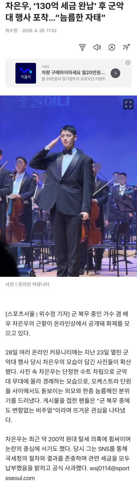 '130억 세금 완납' 차은우 근황 떴다…군악대 행사서 포착