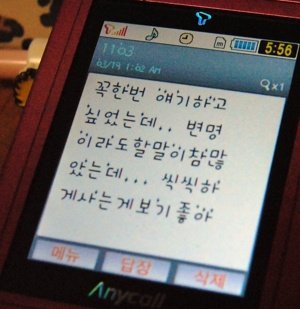 핸드폰을 산 첫 날, 친구랑 밥을 먹고 있는데 문자가 오더군요