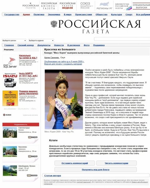 만약, 주리가..러시아 볼쇼이 발레스쿨에서 뻘짓하고 다니고 간판하나만 딸려고 다녔다면...... 러시아에서 이런 기사를 내보냈을까?