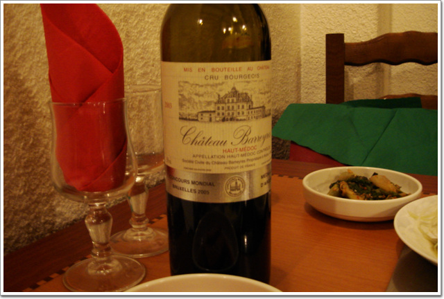'봉': 암소한마리하고 와인 오메독 먹었습니다. 물론 와인은 주인아저씨가 추천해준거구요. 식당분위기 많이 파리스럽고 아저씨의 친절하면서도 여유있는 모습이 무척인상적이고 포근했던 그런집입니다. 음식맛은 외국에 있는 한국식당들이 그러하듯 깔끔하고 정갈한 맛이구요. 아저씨가 "우리집 된장 맛있습니다."하고 내주셨던 된장찌게맛도 일품이었습니다. 바닥까지 비웠음. ^^; 고기는 일류고깃집만큼 좋은질은 아니지만 나름대로 괜찮았습니다.