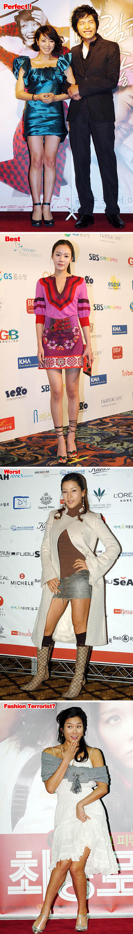 지난 16일 오후 서울 신촌 메가박스에서 열린 영화 '최강로맨스' 시사회. 이날 현영은 최악의 엇박자 스타일을 선보여 패션 테러리스트로 선정됐다. 깜찍한 포즈와 우아한 헤어스타일, 겉도는 케이프, 청순한 원피스. 모두가 따로 놀기 바빴다. 특히 가장 큰 문제는 어깨에 두른 회색 케이프였다. 회색 컬러, 니트 재질, 술 달린 우아한 스타일까지. 케이프의 모든 점이 청순한 원피스 그리고 톡톡 튀는 현영의 이미지에 동화되지 못했다. 한꺼번에 여러 가지 스타일을 확실한 컨셉 없이 시도했다가는 실패하기 쉽다. 현영은 자신이 가진 이미지 컬러가 강한 스타이다. 때문에 만약 그가 이날 청순한 분위기를 연출하고 싶었다면 포즈와 표정까지 일관되게 연출해 줬어야 했다. 하지만 그러지 못했던 현영은 정신없고, 스타일 없고, 개성마저도 없어 보였다.