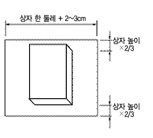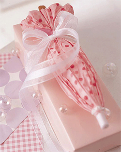 1 상자 길이의 두 배 길이로 자른 도트 무늬 습자지 중심 부분에서 주름을 잡은 후 반을 접어 모양을 잡고, 끝자락을 잡아 당기면서 라인대로 주름을 정리한다.2 포장지 끝자락의 재단선이 드러나지 않도록 안쪽으로 시접을 접어 넣은 후 계피를 끼워 우산대를 만든다. 우산대와 우산이 겹쳐지는 적당한 위치에서 포장지를 자연스럽게 주름 잡아 오므린다.