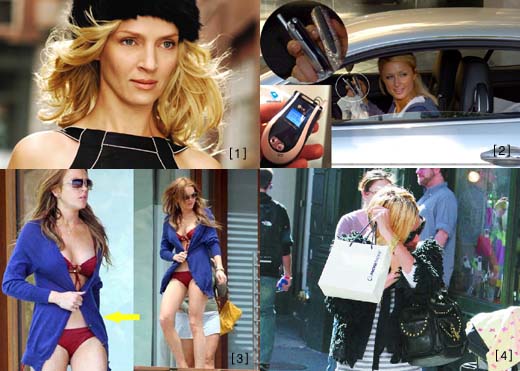 ▲1.피곤할때 아모레퍼시픽을 바른다는 우마서먼. 2.패리스힐튼이 LG싸이언을 사용하는 모습. 3.파파라치 사진 속 린지 로한 Y&Kei의 카디건을 걸치고 있다. 4.아모레퍼시픽 스파서비스를 받고 나온 뒤 파파라치 세례를 맞은 시애나 밀러.
